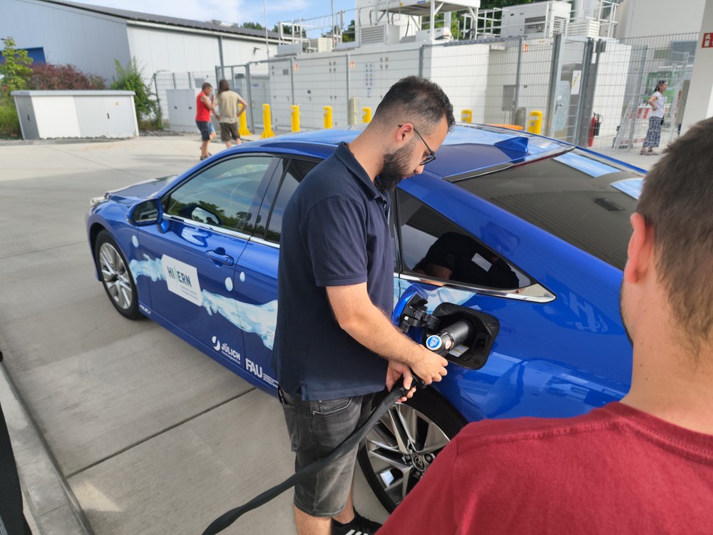Erlangen, 14. Juli 2023 - Eine komplette Wasserstoff-Lieferkette im realen Einsatz erleben und sich mit Forschenden über neueste Forschungsansätze austauschen - das konnten die Besucherinnen und Besucher bei hochsommerlichen Temperaturen am Infostand an der Wasserstofftankstelle in Erlangen.